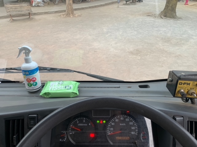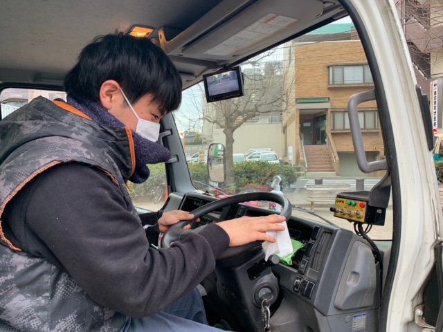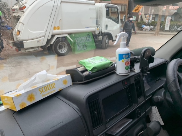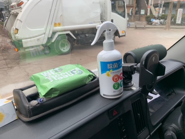 従業員はマスク着用して施工しています。また、消毒液を常備し車内・工具は常に除菌を行うなど、感染症対策を徹底しています。